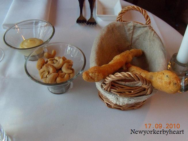 Til at starte med fik vi en let appetizer bestående af de lækreste grissini (se opskriften længere nede) jeg nogensinde har fået. Jeg har indtryk af at de måske var stegt i olie/friteret, uden at de var fede i det, men de var sprøde på den der lækre måde. Dertil fik vi en SKØN aïoli og nogle saltede cashewnødder, det var et hit.