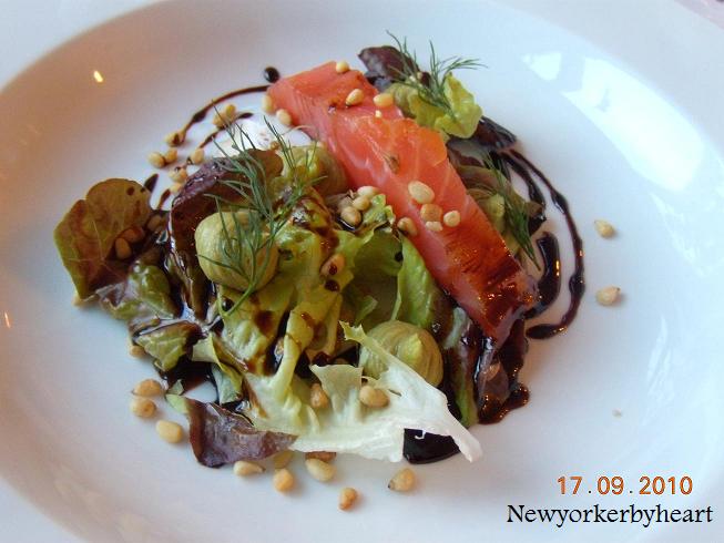 Første forret var røget laks, med avocadocreme, pinjekerner og balsamicoglace. Lækre smagskombinationer og laksen smeltede nærmest på tungen. Dertil Terra Firme Albarino, Rias Baixas 2009.